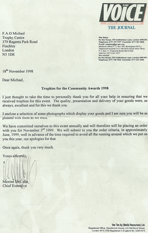 In November 1998 the Trophy Centre supplied awards to the Voice Journal's 1998 Community Awards.