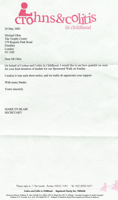 In May 2002 the Trophy Centre donated medals to the charity organisation tackling Crohns & Colitis in Childhood.