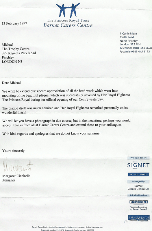 In February 1997 we supplied a plaque to commemorate the official opening of Barnet Carers Centre by the Princess Royal.